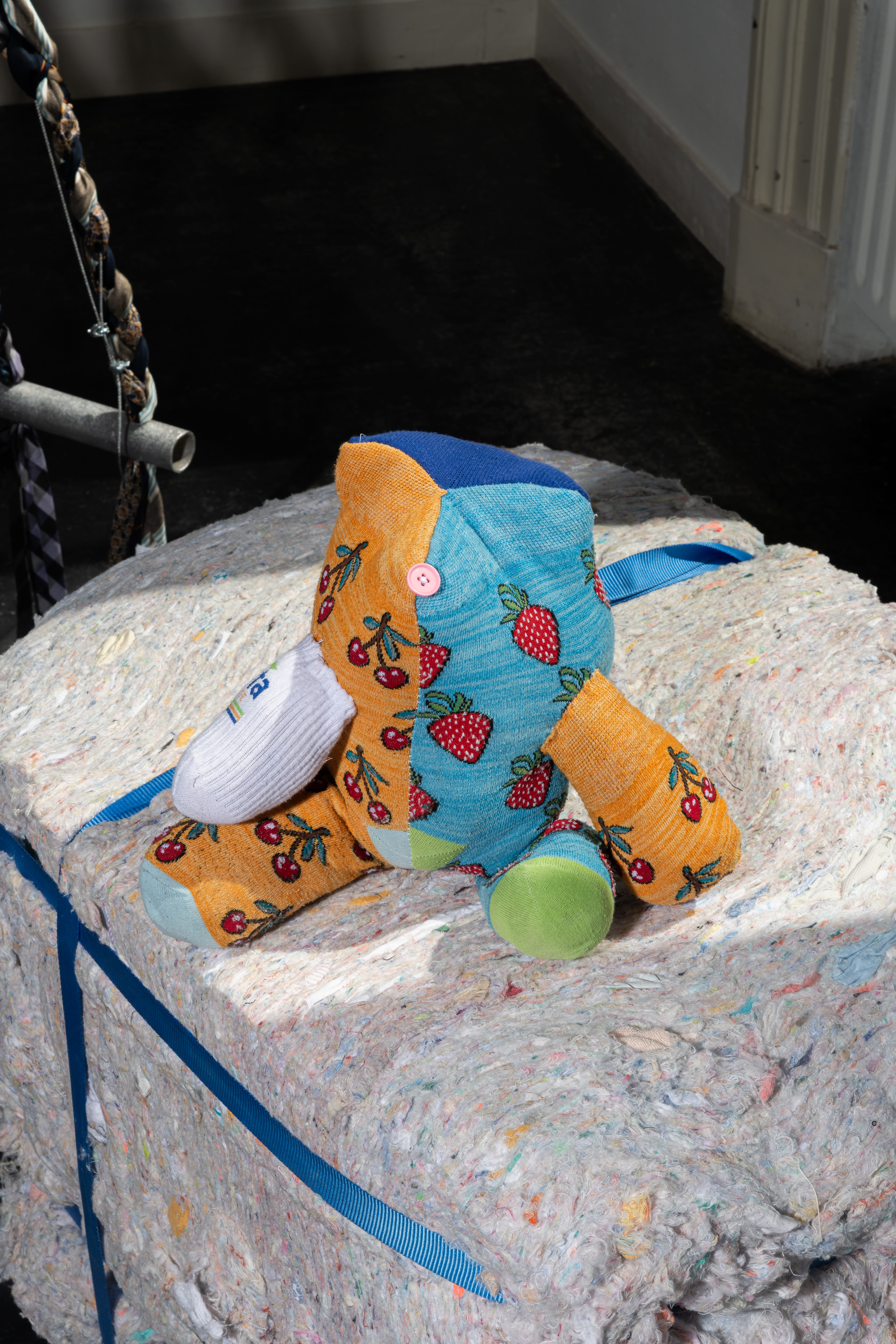 This collection emerges from broader material research, with each of the three objects representing a distinct deadstock stream: Utility (the unusable), Hygiene (the unworthy), and Relevance (the undesirable). Shredded textiles from I-did (a recycling company) are combined with techniques like braiding, knotting, and patchwork, preserving visible fragments of the original garments, keeping their material histories and embedded narratives alive.