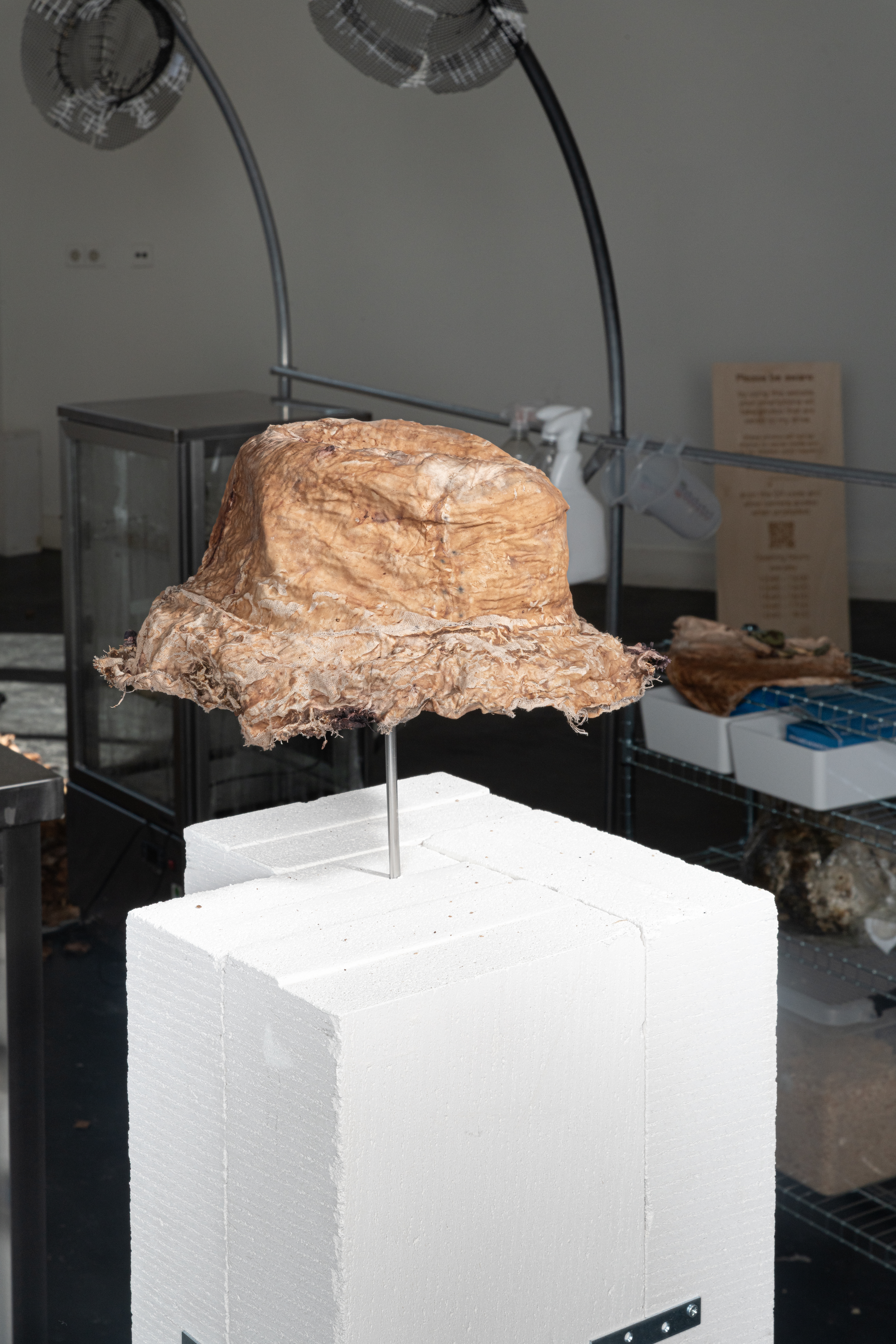Representative of this tension, fungal mycelium was examined. Working with Pure Mycelium Material (the fungal organism in its pure form, mostly used for leather-like applications) enabled a practice that takes a fungus from the forest, cultivates it in the laboratory, and, after harvesting, reintroduces the remains of the process – a reproductive fungal organism – into its original habitat.